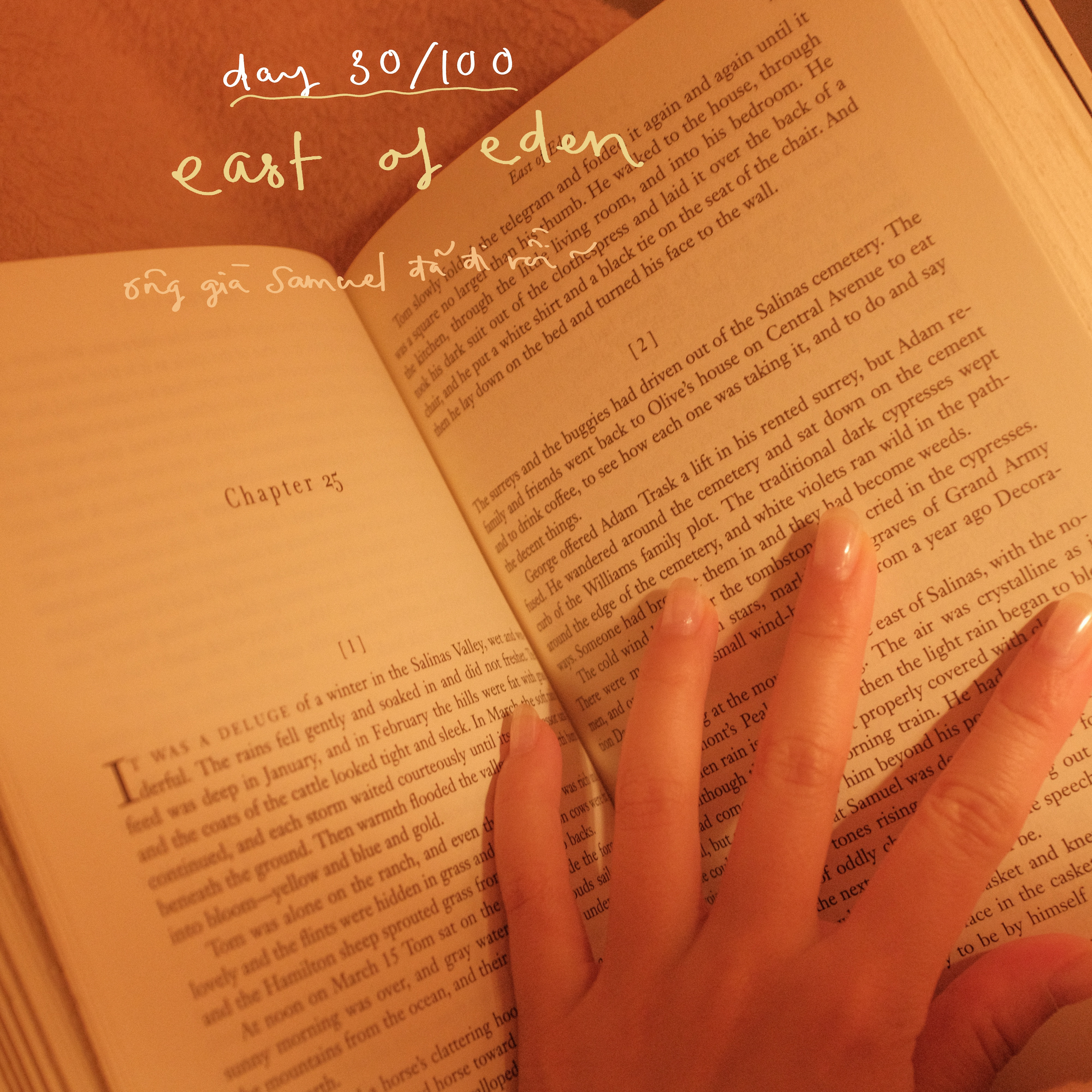 Sau khi ăn xong, thường tôi đọc East of Eden và xem Frankenstein. Tôi đã đọc xong East of Eden và dự định sẽ viết một bài riêng về cuốn sách tuyệt đẹp này. John Steinbeck, tác giả cuốn sách, ông đã lựa chọn từ ngữ một cách tinh tế, khiến mỗi câu đều đầy trọng lượng và trí tuệ, một cuốn sách dày nhưng không gì câu gì là lãng phí. Đọc nó giống như đi dạo qua một khu vườn yên tĩnh của tư tưởng. Khép sách lại, nhưng những ý tưởng vẫn đọng lại, vang vọng trong tâm trí tôi.